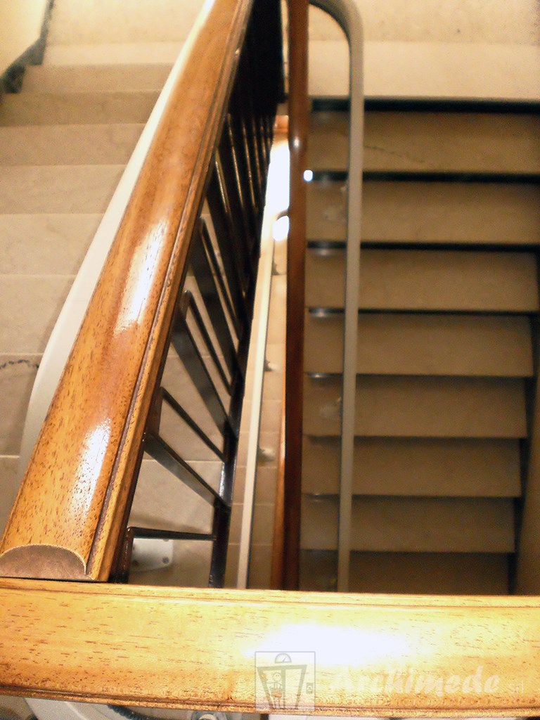 Installazione di Montascale a Poltroncina Acorn 180 su scala in marmo curva, in condominio. Minimi ingombri garantiti, per il rispetto dello spazio comune.