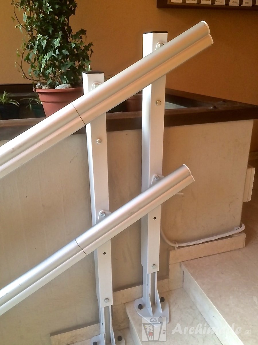 Installazione di Impianto Servoscala a Pedana porta carrozzina Logic per esterno su scala rettilinea, fissato su piedini autoportanti senza ancoraggio al muro. Accesso alla pedana sia laterale che frontale.